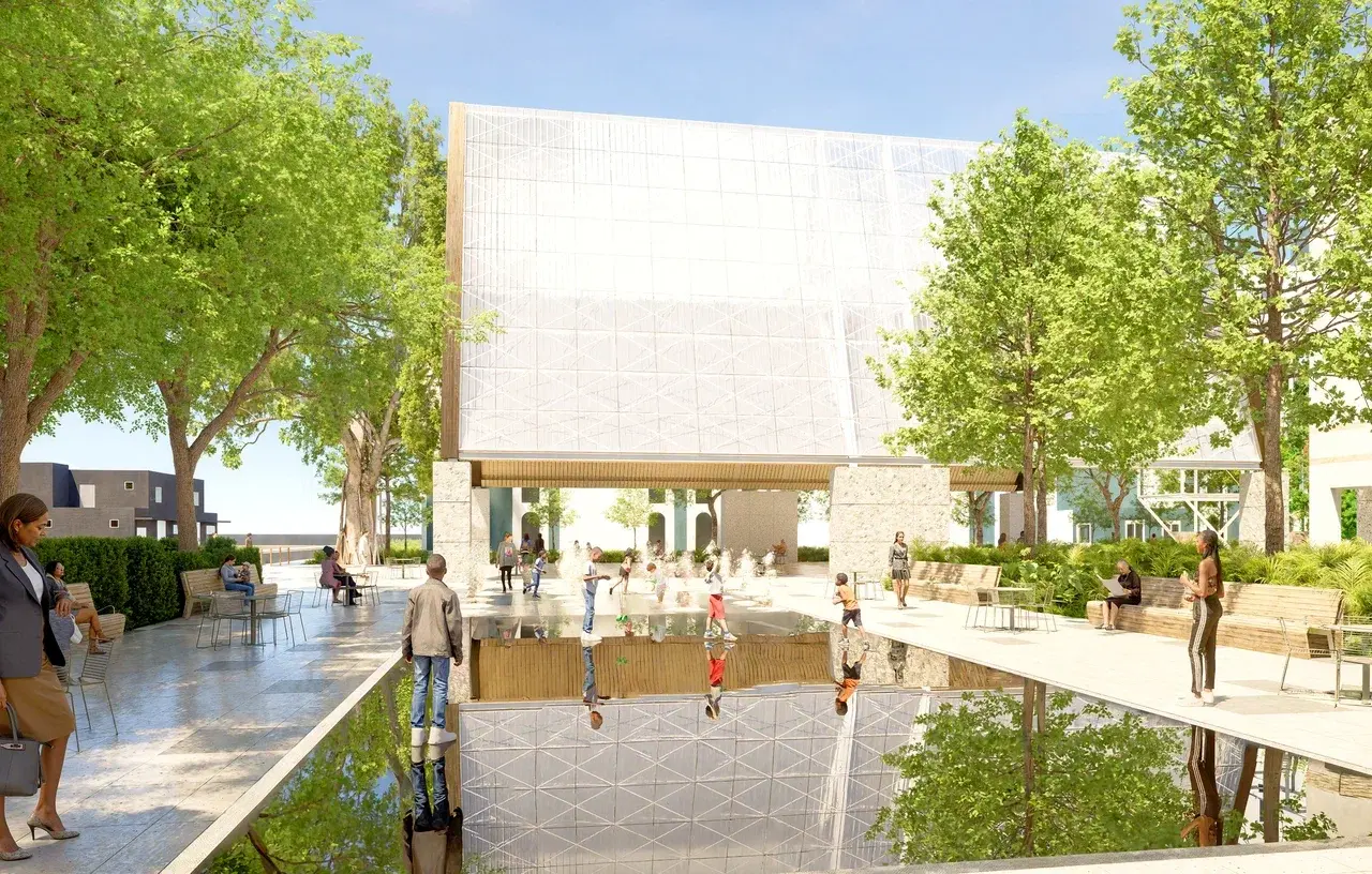 Вокруг этих ключевых элементов размещены художественные акценты — скульптуры и масштабные навесы в форме афро-пика. Эти образы укореняют проект в культурной памяти объекта и передают дух импровизации, присущий данному месту.