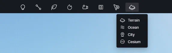 Ocean добавляется через верхнюю панель инструментов: Terrain → Ocean. После добавления объект появляется в списке ресурсов, а в боковой панели открывается панель управления параметрами воды.