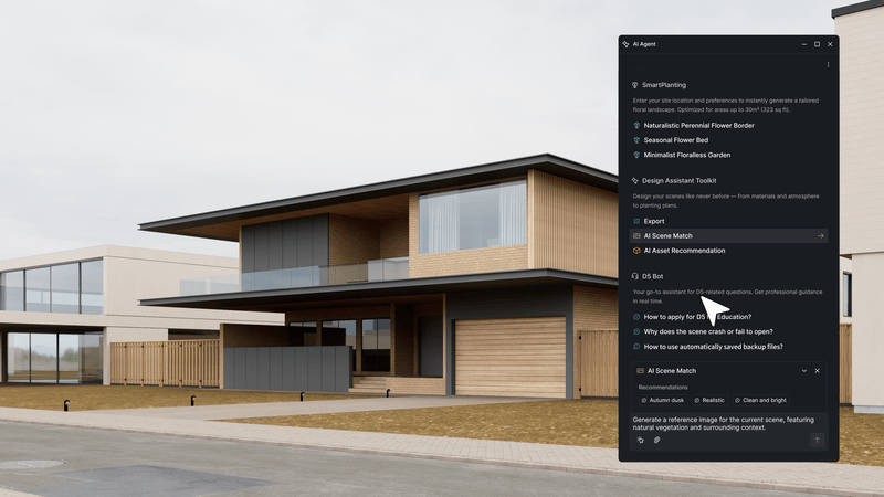 AI Agent создаёт референс-изображение, ориентируясь на текущую камеру и композицию, и переносит параметры освещения и цветовой схемы в вашу сцену. Также он автоматически предлагает подходящие ассеты из библиотеки D5 — на основе анализа визуальных элементов и материалов.